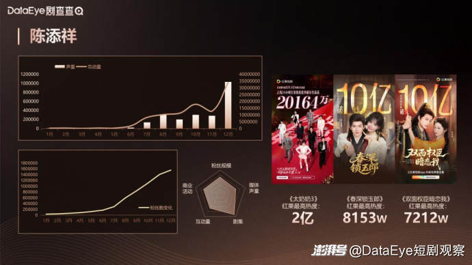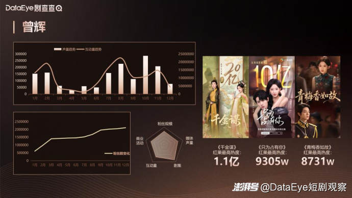 曾辉在25年的发展较为稳扎稳打,在上半年《他过分野》播出之后,他的数据保持一个持续的增长。在6月与头部厂牌听花岛签约后,其剧集、商业价值、粉丝等凭借其主演的《正义之刃》《没关系是家人啊》《千金谋》《青梅香如故》《十八岁太奶奶》等多个爆款,迎来了一个爆发式的高速增长。其与韩雨彤组成的“落日雨辉”CP组合也对其个人的商业价值有着进一步的反哺,使其成为兼具个人实力与组合效应的头部男演员。