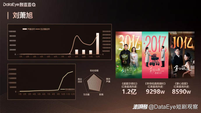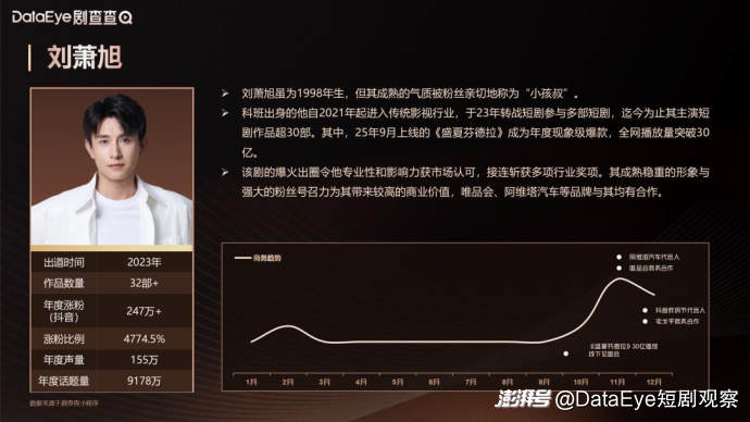 刘萧旭虽为1998年生,但其成熟的气质被粉丝亲切地称为“小孩叔”。科班出身的他自2021年起进入传统影视行业,于23年转战短剧参与多部短剧,迄今为止其主演短剧作品超30部。其中,25年9月上线的《盛夏芬德拉》成为年度现象级爆款,全网播放量突破30亿。该剧的爆火出圈令他的专业性和影响力获市场认可,接连斩获多项行业奖项,其成熟稳重的形象与强大的粉丝号召力为其带来极高的商业价值。而刘萧旭最新与阿维塔汽车的品牌合作, 对于微短剧行业来说有着里程碑式的意义。