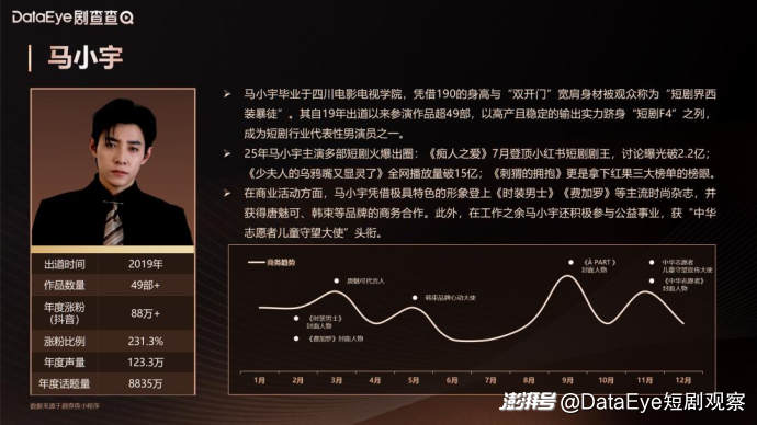 马小宇毕业于四川电影电视学院,凭借190的身高与“双开门”宽肩身材被观众称为“短剧界西装暴徒”。其自19年出道以来参演作品超49部,以高产且稳定的输出实力跻身“短剧F4”之列,成为短剧行业代表性男演员之一。在商业活动方面,马小宇凭借极具特色的形象登上《时装男士》《费加罗》等主流时尚杂志,并获得唐魅可、韩束等品牌的商务合作。此外,在工作之余马小宇还积极参与公益事业,曾获“中华志愿者儿童守望大使”头衔。