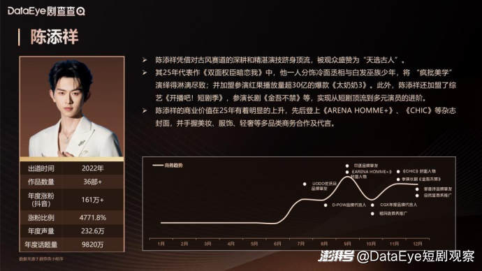 陈添祥属于厚积薄发的代表性艺人,其商业价值伴随着2025年第三季度《双面权臣暗恋我》的火爆出圈而快速增长。由于其入行较早,其作品产出较为稳定,基本每月都有1-2部作品上线,则为其商业价值的持续释放提供了基础的保障。同时,其还作为主演参与到短剧《仙剑三:生情》等大IP之中,并参演了长剧《金吾不禁》,这对其商业价值有了进一步的提升。在商务活动方面,陈添祥先后登上《ARENA HOMME+》、《CHIC》等杂志封面,并且成功获得自然堂、可逐、爱普诗等多个品牌的代言或者商务合作,其中不乏祖玛珑这类高端品牌。