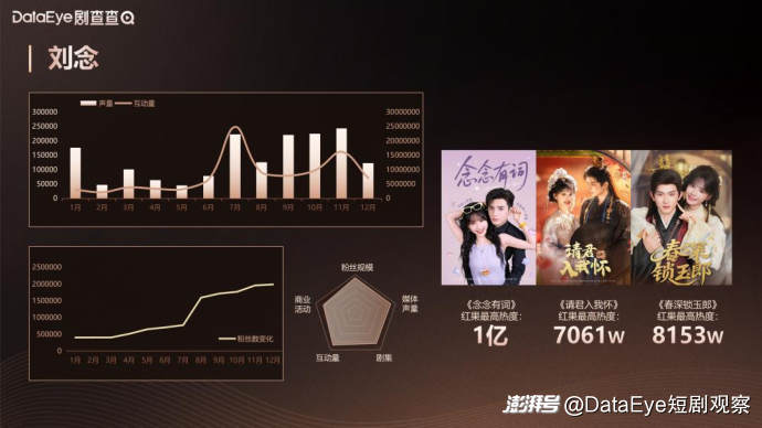 刘念是2025年短剧赛道快速崛起的新晋顶流艺人,偶像女团出道背景与表演专业深造的经历帮其实现了从唱跳舞台到短剧银屏的成功跨界。相较于高产型艺人,其作品数量虽少,但爆款率却表现突出。刘念主演的《请君入我怀》《成何体统》《念念有词》等核心作品凭借其灵动的表演,均成为现象级爆款,其《念念有词》上线四天红果平台热度破亿,成为该平台首部热度破亿的短剧作品。其与何聪睿组成的 “百念好何” CP组合 “三搭三爆” ,令其成为年度艺人成长速度与市场认可度双高的代表人物。