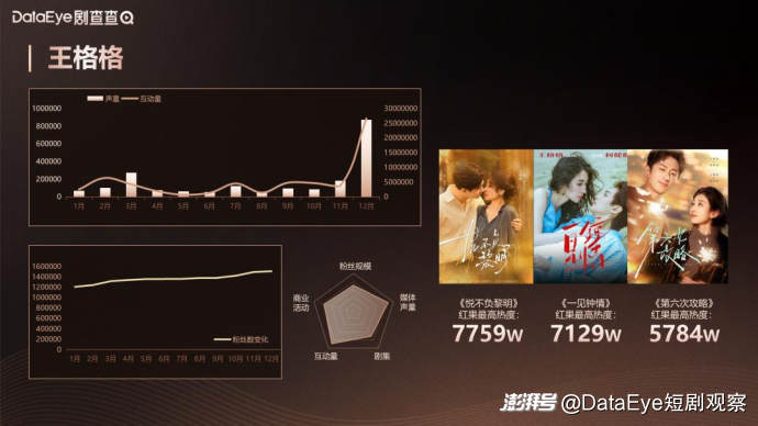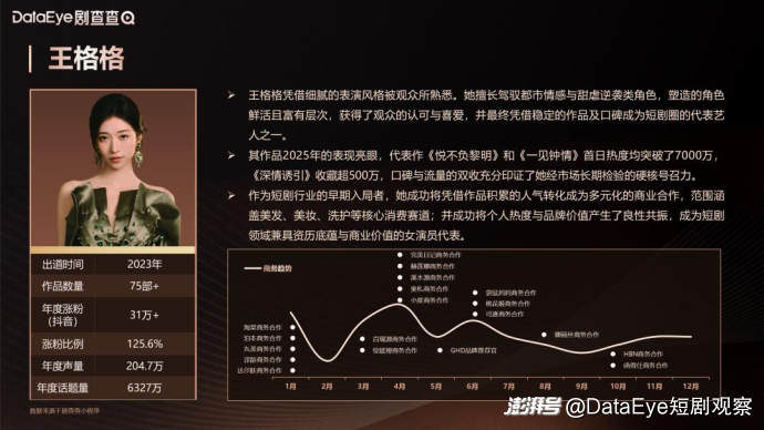 王格格凭借细腻的表演风格被观众所熟悉。她擅长驾驭都市情感与甜虐逆袭类角色,塑造的角色鲜活且富有层次,获得了观众的认可与喜爱,并最终凭借稳定的作品及口碑成为短剧圈的代表艺人之一。作为短剧行业的早期入局者,她成功将凭借作品积累的人气转化成为多元化的商业合作,范围涵盖美发、美妆、洗护等核心消费赛道;并成功将个人热度与品牌价值产生了良性共振,成为短剧领域兼具资历底蕴与商业价值的女演员代表。