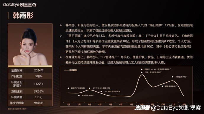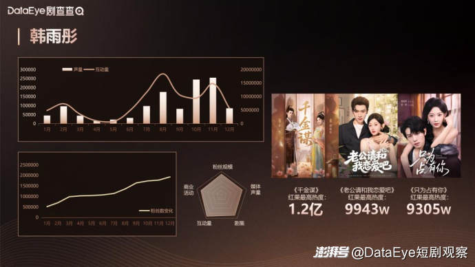 韩雨彤是2025年短剧圈高爆款率的代表性艺人,其半年内主演的短剧7部播放量突破十亿。依托科班出身的表演功底,其角色塑造能力灵活多变,既能精准诠释重生财迷少女的灵动俏皮,也能完美驾驭清醒独立职场女性的沉稳干练,角色适配度与表演完成度广受市场认可。她与曾辉组成的“落日雨辉”CP组合凭借高默契度的荧幕表现和高频次的营业受到市场的认可和肯定,作为2025年短剧圈最具影响力的CP搭档组合之一,也对其个人的商业价值有着持续的加成。