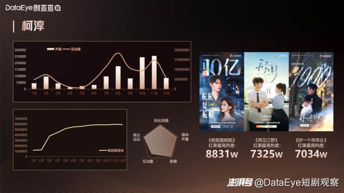柯淳自年初《好一个乖乖女》爆火出圈后,粉丝量和全网曝光度持续上升。从25年2月到5月仅3个月,其全网粉丝增长超400万,并且持续保持一个较高的月增长数。截止至25年12月底,其粉丝数超过592万,是目前短剧男艺人中粉丝数量最高的艺人,并且断崖式领先。在其25年爆火出圈后,其还参加了《无限超越班》《王牌对王牌》《一路繁花2》等一系列长视频平台综艺,涵盖优酷、爱奇艺等多平台,与众多影视行业资深艺人合作并且获得好评,在下半年持续保持较高的社媒讨论热度,年度声量超1134万,话题量高达3.95亿,并多次登上微博热搜,是短国破圈进军长剧的代表性艺人。