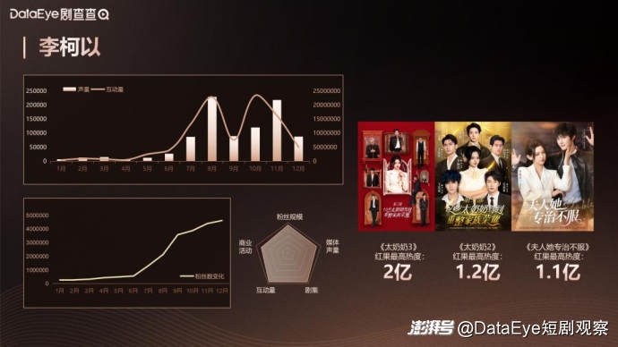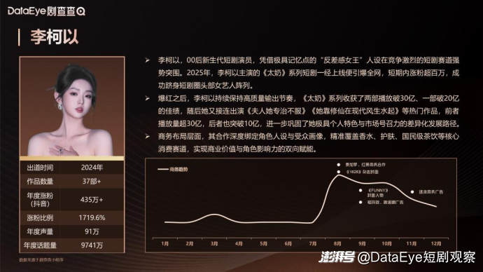 李柯以是2025年短剧领域系列短剧主演的代表。其主演的《十八岁太奶奶驾到,重整家族荣耀》《夫人她专治不服》等系列短剧都在市场上有着超高的热度与话题量,成为行业系列短剧的标杆。作为2025年播放量破30亿作品最多的艺人,她的粉丝量自6月开始暴涨430万,为其摘得年度短剧女艺人涨粉速度的桂冠,也为其带来了商业价值大幅提升,使其成为兼具商业价值与话题热度的核心代表艺人。