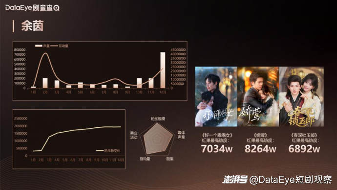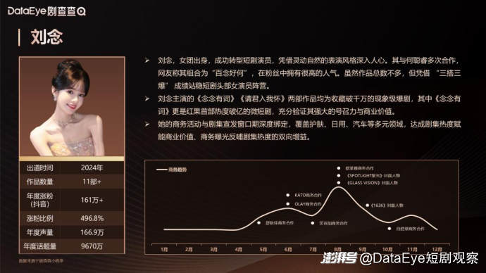 同时,DataEye研究院在统计中发现,很多微短剧艺人由于专注于短剧作品的创作,并没有将商业价值的维护作为重点,一定程度上影响了其商业价值的转化以及品牌对其商业价值的认可度。现在是“ 酒香也怕巷子深 ”的时代,如何“ 多元化维护自身商业价值 ”,对于艺人而言正 在变得越来越重要。
