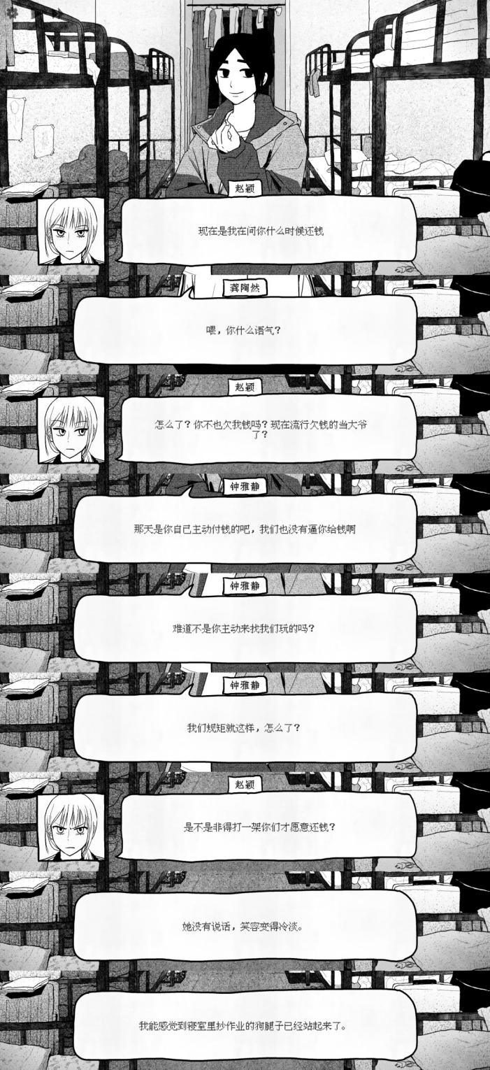 值得注意的是,这一切几乎都发生在学校的视野之外。本应行使制度权力的学校并没有承担起干预、调节、保护的责任,而是近乎完全缺席,放任学生自行承受松散结构引发的次级暴力。学校空间并未直接对赵颖施加压迫,却也始终未能真正地保护她。在家庭之外,她再次被置于一个缺乏支撑、需要独自应对风险的空间之中。这种松散与暴力的并存,构成了她校园经验中难以回避的另一重困境。
