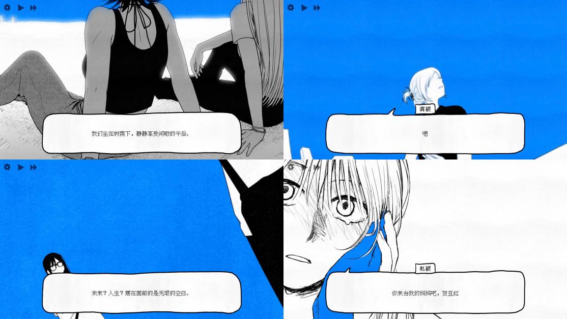蓝色并不贯穿每一段叙事,而是零散地分布在少数结局与成就图标之中,既不改变游戏的整体基调,也无法覆盖黑白世界的压迫感。王艺菡线中出现的蓝天,首先指向的是地理层面的跨越。相较于小城空间的封闭与窒息,异国的天空与海滩构成了一种对远方的想象。在蓝色的天空下,赵颖第一次获得伸展身体与意识的可能。蓝色,成为一个离开既有空间的标记。徐敏敏线的true ending中,蓝色则以更加抽象的形式出现。成就图标中那片几乎吞没人影的纯蓝,更像是一种身份状态的悬置。赵颖改姓、脱离旧家庭、建立新生活秩序,这些变化并未在叙事中被充分展开,而是被压缩进一块颜色之中,作为结果被展示。