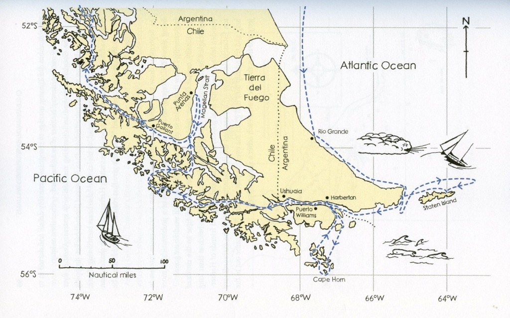 “海上漫游者”号从布宜诺斯艾利斯出发,沿着巴塔哥尼亚到瓦尔帕莱索的路线