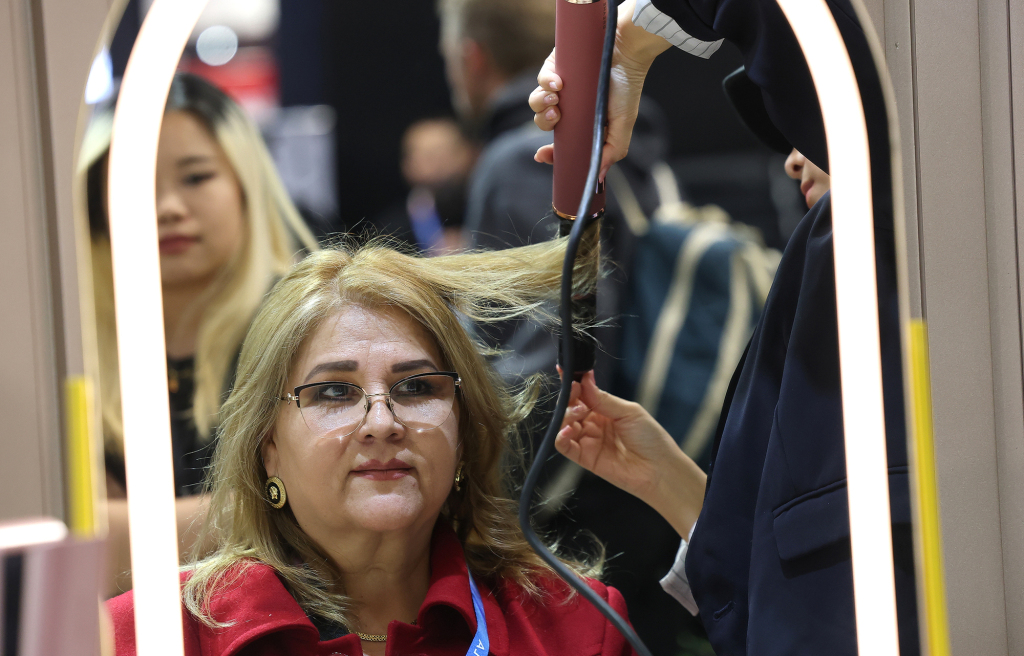 1月6日,美国拉斯维加斯,参观者在中国企业Dreamy展台体验卷发棒。