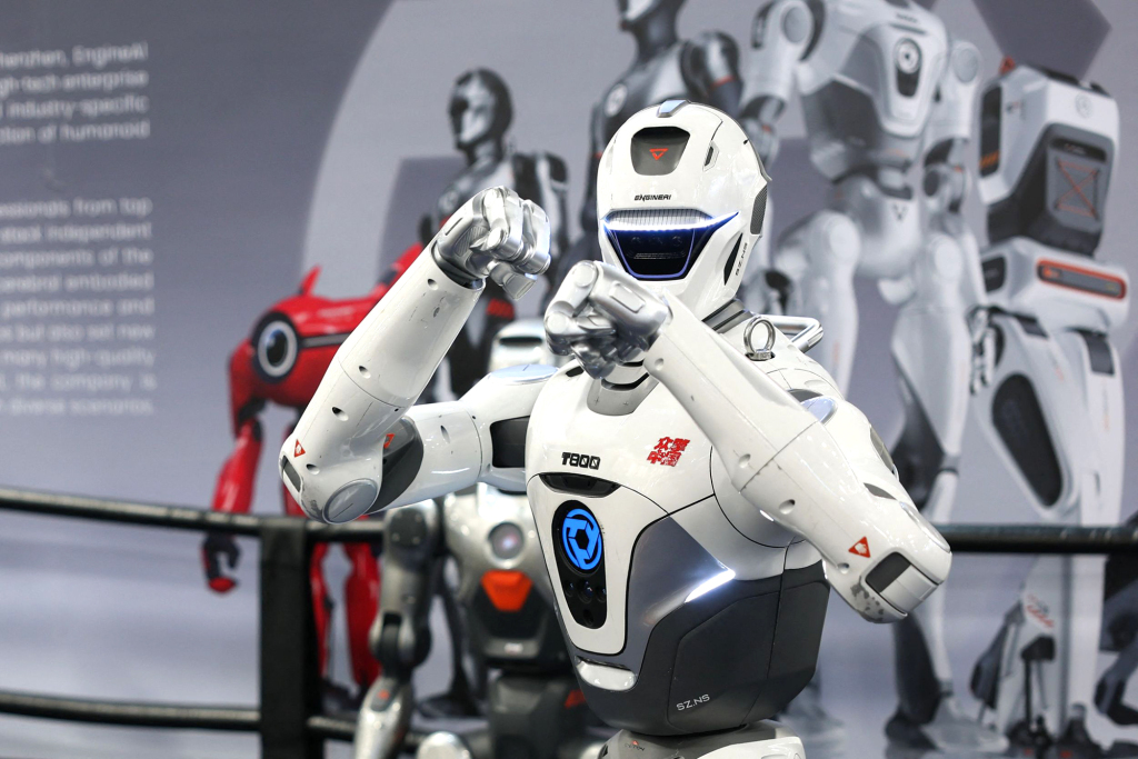 1月8日,在美国拉斯维加斯消费电子展上,人们在宇树科技展区观看机器人展示。