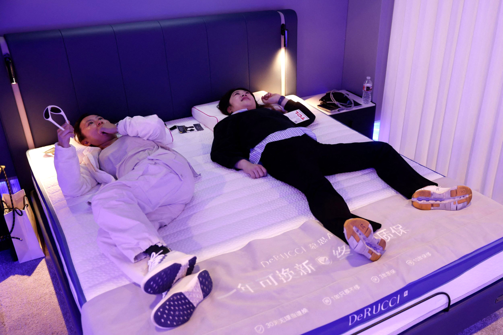 1月6日,美国拉斯维加斯,参观者体验慕思(DeRUCCI)AI床垫。该床垫利用传感器和人工智能监测睡眠生物特征,并自动调整机制以改善用户睡眠。