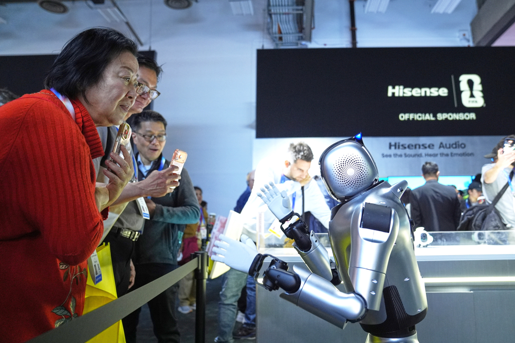 1月6日,美国拉斯维加斯,人们在CES上观看海信机器人。