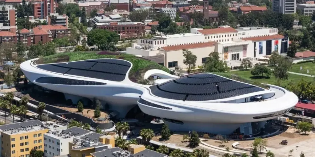 距离洛杉矶郡艺术博物馆(LACMA )东南数英里处,历经八年建设的卢卡斯叙事艺术博物馆将于 9月 22日正式开放。电影导演乔治·卢卡斯将其个人艺术收藏置于这座造价 10亿美元、面积达 30 万平方英尺的新馆中。这座由马岩松设计的未来主义建筑坐落于博览会公园,不仅在建筑形态上突破常规,其景观设计与核心理念更是深刻诠释了 “人之所” 的内涵。博物馆拥有 30余个展厅,展品横跨《星球大战》电影道具、古代雕塑、数字艺术,以及史前洞穴壁画的沉浸式复原。