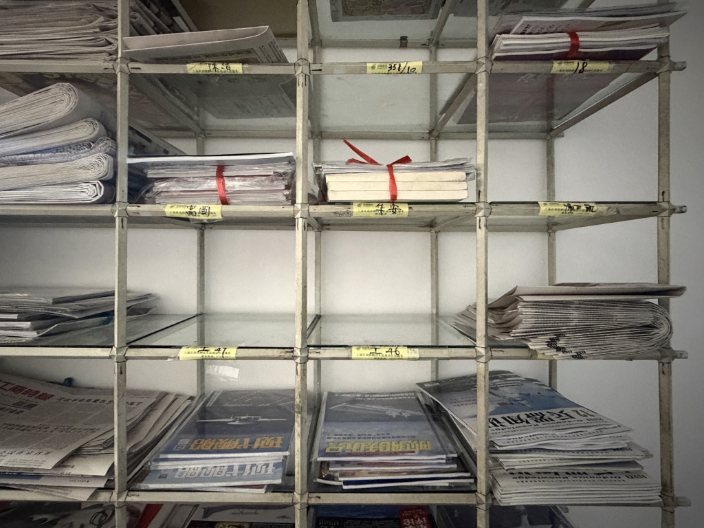 在店铺后场的角落里,还摆放了几个高大的铁质书架,每一层都用黄色便利贴隔出位置,写好名字,这是姜师傅的读者预约架。至少有几十位读者在他这里常年订报,种类、频次各有不同,姜师傅用小卡片整理了读者名单,一有空闲就为读者配货,每天的报纸杂志整整齐齐地摞好摆放在书架上,等着读者来取。