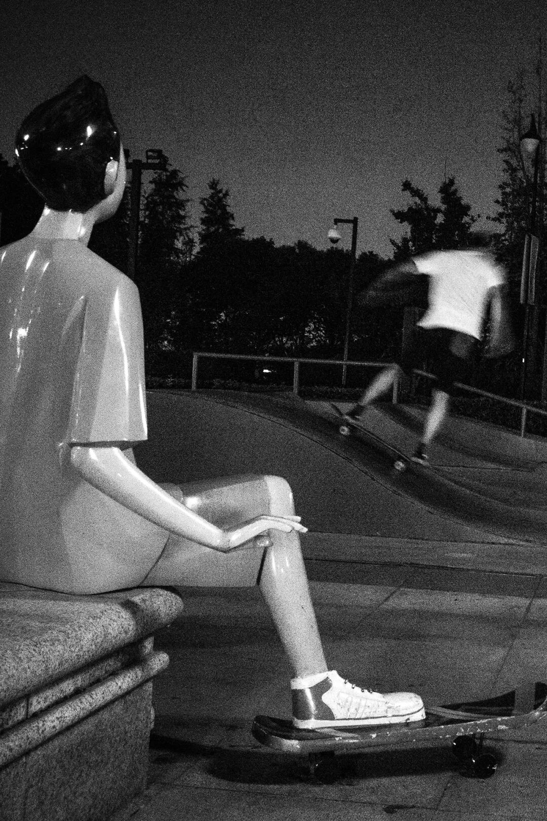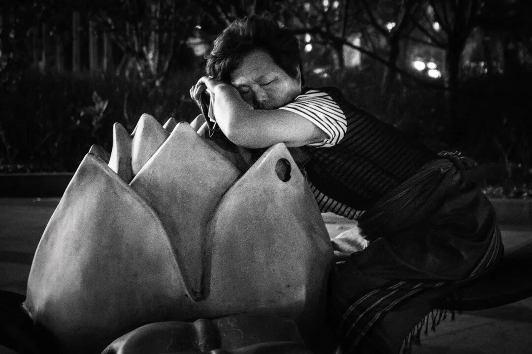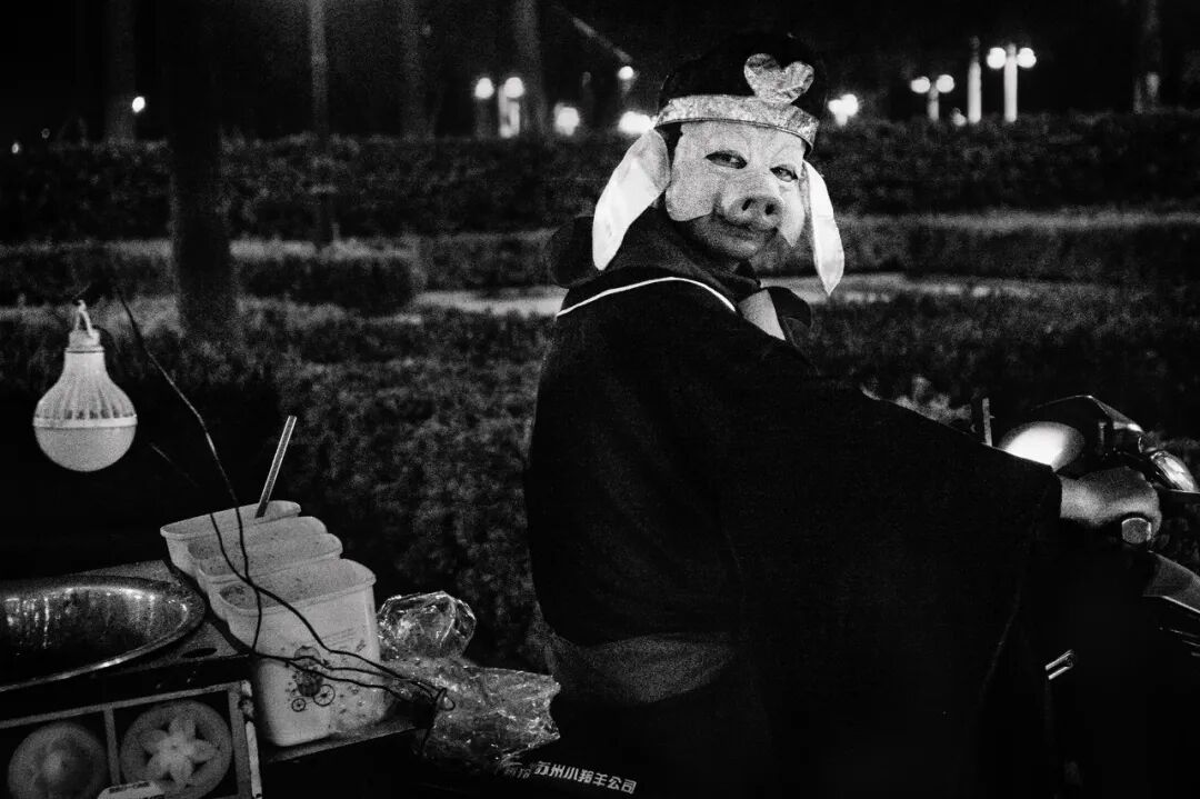 这些沿着大街小巷、街心广场拍摄的人物、景象,有着天然的贴近性。这儿的人,这儿的草木,这儿的光亮或暗影,都是大波以及与大波这样奔波于苏州的人生活的组成,它们属于“本地人”,它们如同家常便饭般平常、朴素、亲切,周而复始得近乎单调,却须臾不可离。其中的陌生感不是场域给予的,而赖于时间、巧合和发现。这不同于在大型公园拍摄的景象——大公园是给外地人准备的,属于奢侈的消遣或消费,却常常与“本地人”的日常生活没有多少勾连,其中的戏剧性很可能是场域性的、外来的。因此,郁大波摄影中所蕴藏的情感,或许就是那个带着猪八戒面具卖羊肉串儿的、那个卖花姑娘的、那个在廉价躺椅上酣然入睡的老者的。推而广之,在“全球一村庄”的当下,它是属于所有城市人的。任何人都能够与郁大波一起身临其境;任何人都能够与郁大波一样感同身受。