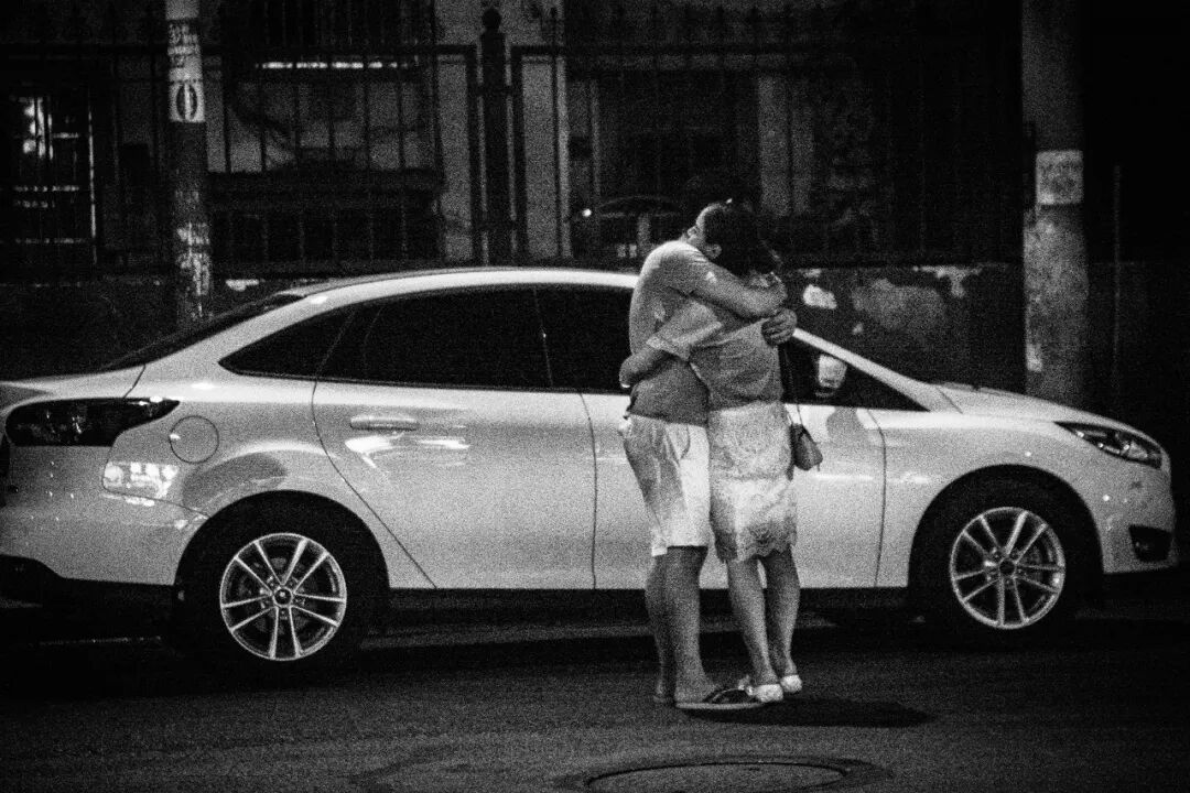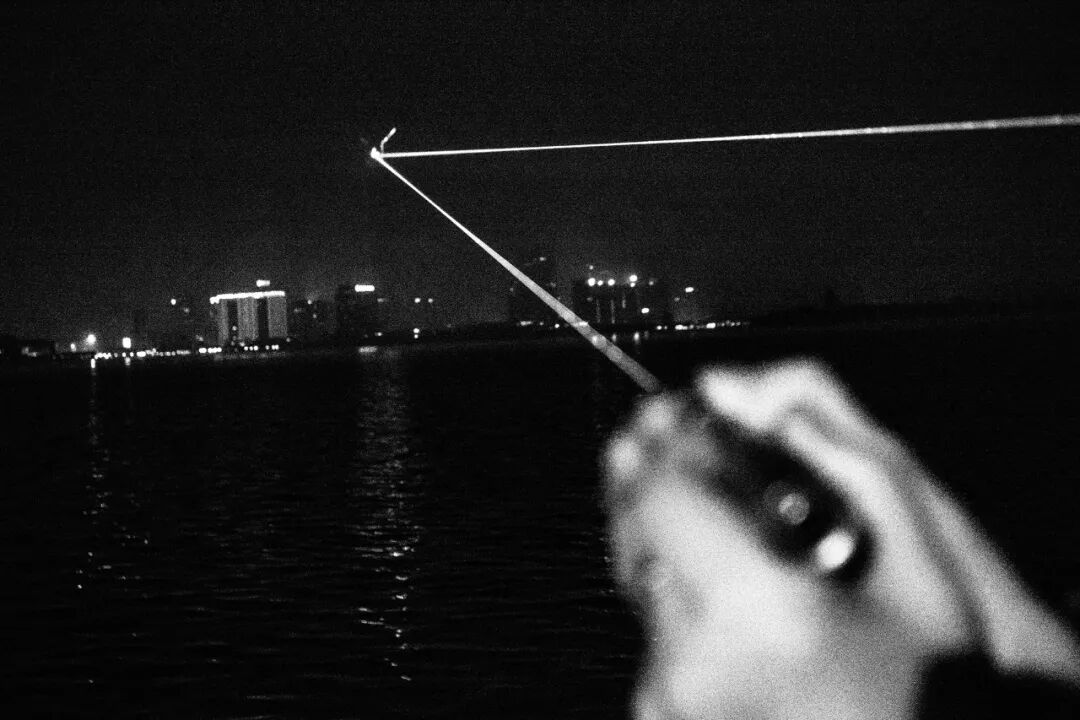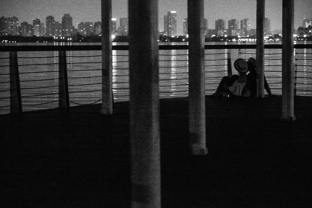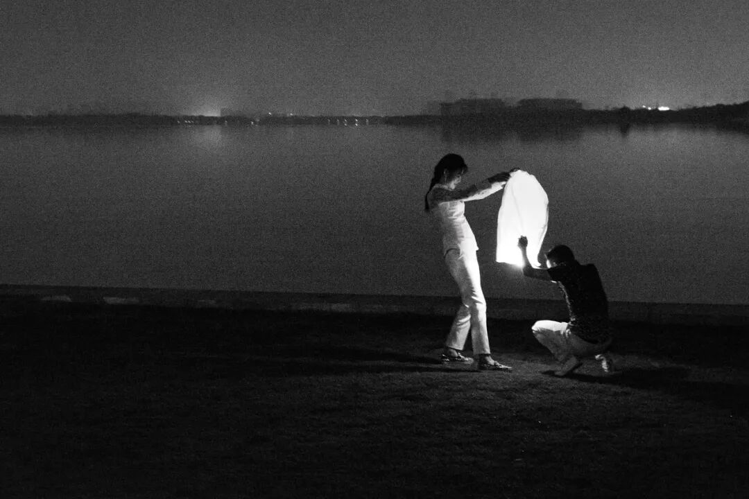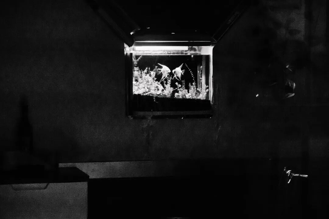 “黑夜给了我黑色的眼睛,我却用它寻找光明。”顾城的隐喻仿佛是大波摄影的注脚。实际上它也是我们所有人的心理注脚。我们对外部世界有着本能的恐惧,这不是机体上的恐惧,而是精神上的恐惧,五光十色的现象世界带给我们的不是坦荡的虔敬,而更多的是因为纷乱和变动不居造成的无所适从。恐惧与创伤成为每一个人生活的常态,只是我们本能地拒斥着这种状态,从而强化我们追求美好与幸福的信心与决心,或者满足生活于大城市的虚荣心。因此,一方面,我们大多数人都没有向命运妥协的机会,没有打折生命的机会,我们尚没有学会在精神层面上与自己握手言和。这方面的无识无觉甚或无能,反而进一步加剧了日常的恐惧与焦虑。另一方面,“人往人处走”,我们本能地希望群居,拒绝孤独。我们下意识地希望在我们的同类那里得到慰藉和呼应。这是大波不断拍摄暗夜中的情侣,甚至两条接吻的鱼的潜意识动机。他试图用摄影在白天与黑夜、负重与缓释中寻找某种平衡,从而用这种稍纵即逝的、虚拟的平衡,对抗现实的沉重。