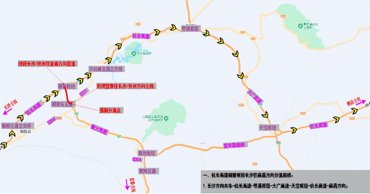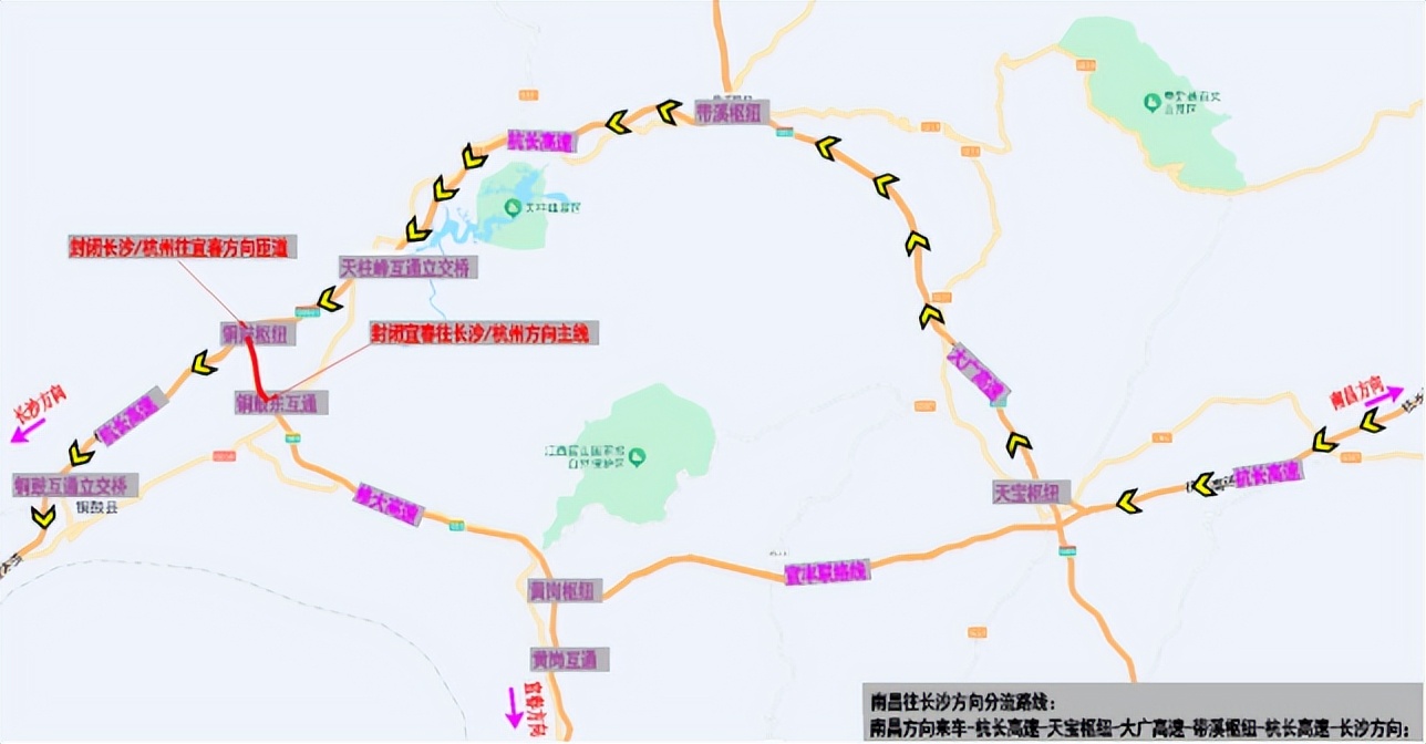 南昌方向来车→杭长高速→天宝枢纽→大广高速→带溪枢纽→杭长高速→长沙方向。