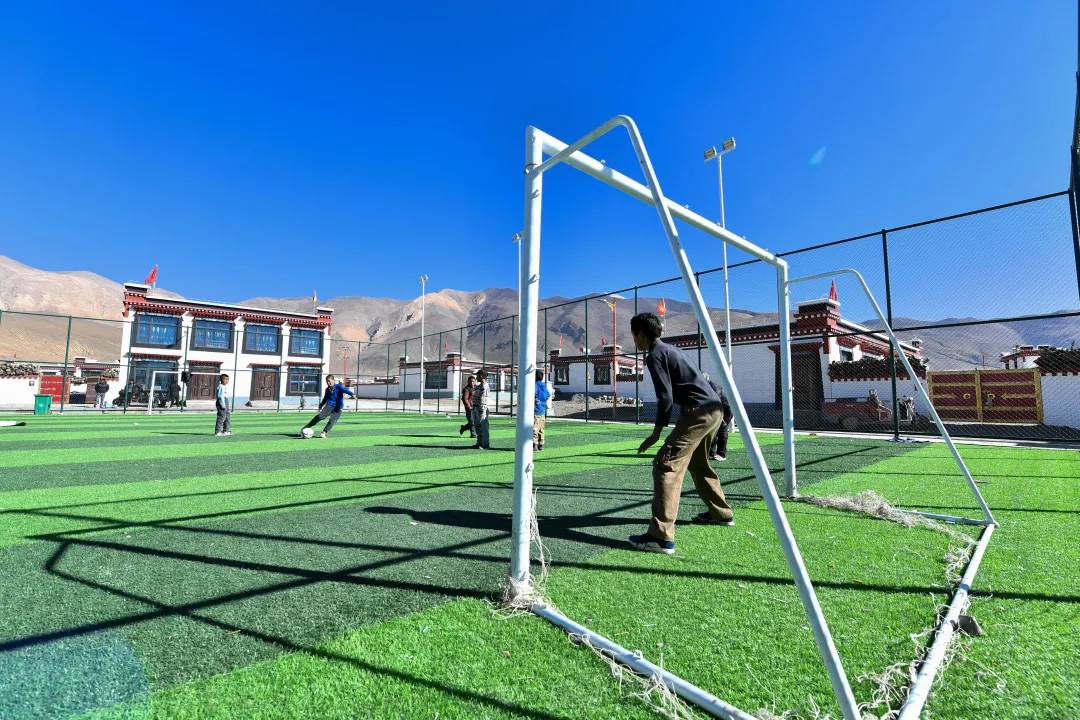 2026年1月2日,定日县长所乡森嘎村新修建的足球上,孩子们在踢足球。