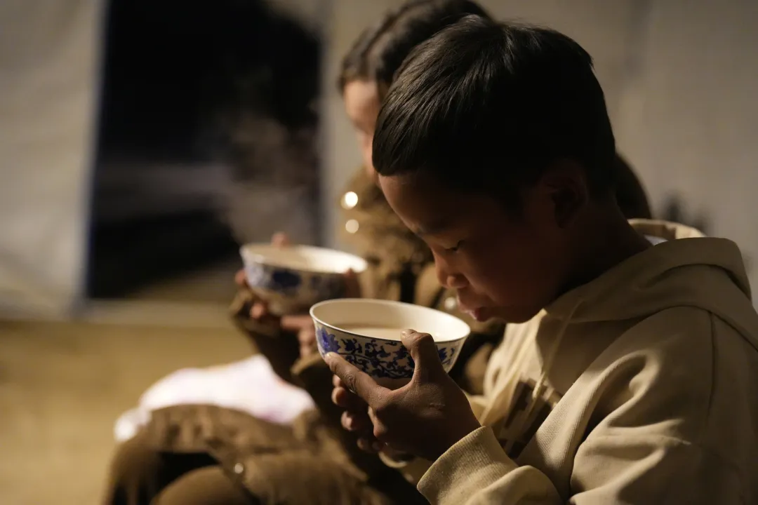 图为地震第一天,拉孜县曲下镇土林村11岁的普布扎西吃上灾后第一顿饭。(拉孜县融媒体中心供图)