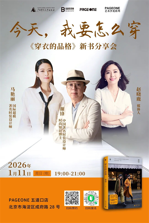 我们常常被告知什么是“时尚”,却很少有人真正告诉我们:时尚,究竟与普通人的生活有什么关系?它是否只属于年轻人,属于潮流和昂贵的标签?在《穿衣的品格》中,服装设计师谢锋有着不一样的思考。1月11日晚,谢锋将携新书《穿衣的品格》与国际超模马艳丽、媒体人赵晓鹿一起做客PAGEONE五道口店。在这次新书发布会上,谢锋将首次系统分享本书的创作缘起,谈穿衣如何在人生的不同阶段赋予人力量,也谈年龄、气质与风格之间的关系。