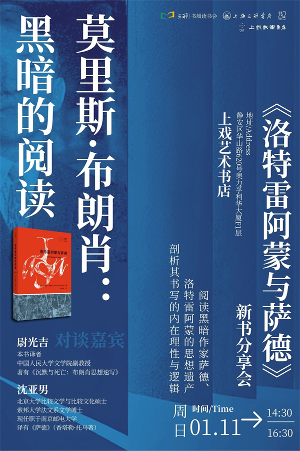 当布朗肖×萨德×洛特雷阿蒙,我们将看到何种黑暗的阅读?通过剖析极端、迷乱、癫狂的文本,我们如何看到作家书写的内在理性?本周日下午,我们将邀请布朗肖新书《洛特雷阿蒙与萨德》的译者尉光吉老师、法国文学及萨德研究者沈亚男老师,一起做客上戏艺术书店,剖析文论家莫里斯·布朗肖对两位黑暗作家——萨德、洛特雷阿蒙——如何展开了黑暗的阅读。