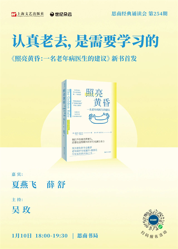 《照亮黄昏:一名老年病医生的建议》是英国老年病学专家露西·波洛克的行医半生记,也是一部关于衰老、病痛与尊严的现实之书。书中对英国医疗与社会政策的细致呈现,为我们提供了重要的借鉴:建设一个让老年人“活得久,也活得好”的社会。1月10日,在思南书局,本书译者、主任医师夏燕飞,上海市作家协会副主席薛舒,上海市作家协会会员吴玫,将和我们一起讨论如何面对那些无可回避的衰老真相,如何尊重、理解并捍卫我们的生命与意志。