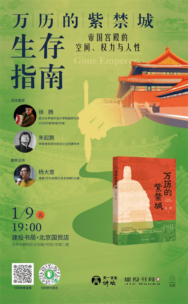 当我们从建筑与空间的角度理解历史,当我们跳出帝王将相的角色意义而尝试挖掘其真实鲜活的人性,我们能否揭开“三十年不上朝”“明实亡于万历”的标签,看见皇帝面具下真实的朱翊钧?1月9日晚,我们邀请徐腾、朱起鹏、杨大壹相聚书局,共同解密紫禁城建筑设计与空间使用,畅聊万历皇帝的个性与日常,发现帝王将相作为“普通人”的喜怒哀乐。