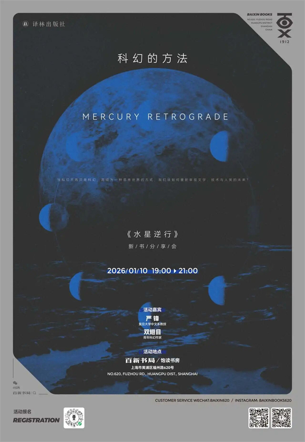 《中国科幻新浪潮》的作者宋明炜曾提出“科幻作为方法”的观点,认为科幻已从边缘文类转变为一种普遍的认知和表达世界的方式。他还提到科幻性与文学性的融合趋势,以及美学与科幻思维的关联。1月10日晚,复旦大学中文系教授严锋,将与全新科幻小说集《水星逆行》作者双翅目于百新书局分享——围绕宋明炜教授提出的“科幻作为方法”这一主题,探讨科幻文学如何反映现实世界,如何以不同的叙事方法探索世界。