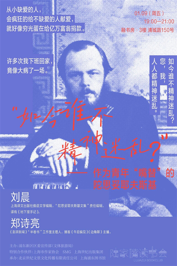 他站上过死刑台,经历过艰苦的西伯利亚苦役,时常“拮据得只想上吊”,终生在癫痫的困扰下生活。他是债台高筑的赌徒,也是洞察灵魂的先知。他就是费奥多尔·陀思妥耶夫斯基。这位来自十九世纪俄罗斯文学中焦虑不安的“老灵魂”,正活跃在当代青年人的社交媒体上。1月9日晚,我们邀请到上海译文出版社编辑、“陀思妥耶夫斯基文集”责任编辑、《地下室手记》译者刘晨,以及《澎湃新闻》“半卷书”工作室主理人、播客《午后偏见》《边角聊》主播郑诗亮做客陆家嘴读书会,聊聊作为青年“嘴替”的陀思妥耶夫斯基。