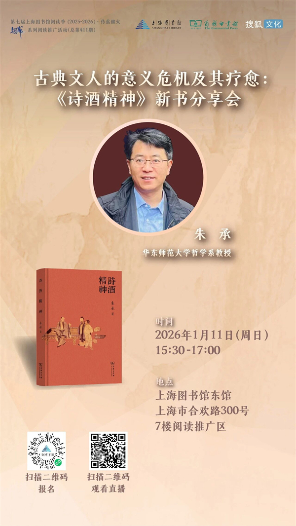 自古以来,中国文士多在诗文中将“酒”作为载体、媒介,通过饮“酒”、写“酒”而得“意”,展现某种精神状态,或者实现某种现实目的。本次讲座,《诗酒精神》作者、华东师范大学哲学系教授朱承,将以“古典文人的意义危机及其疗愈”为核心话题,梳理不同时代文人面临的意义困惑,阐释诗酒如何成为文人消解焦虑、寄托情志的精神纽带,深度剖析古典文人的精神困境与诗酒文化的疗愈内核,带领读者一起探寻诗酒文化背后的文人精神。