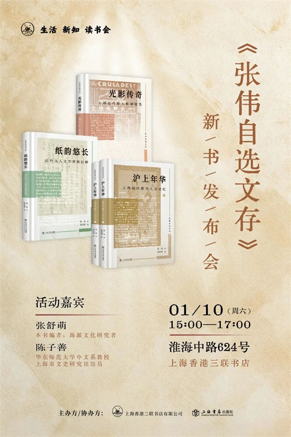 上海图书馆研究馆员张伟长期耕耘于图像文献和城市文化史等领域,在小校场年画、月份牌、土山湾、电影史等诸多领域开风气之先,其研究依托上海图书馆丰富的馆藏资源,并以私人收藏作为补充,所有研究资料均为第一手资料。《张伟自选文存》为张伟生前初步编选,张伟哲嗣张舒萌整理定稿,收入文章60篇,是一套研究上海城市历史文脉以及近现代文学电影的学术集成性专著。1月10日,张舒萌与陈子善将做客上海香港三联书店,与读者分享这套新书。