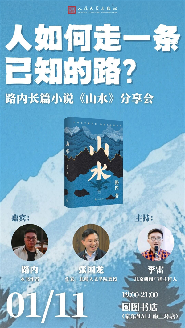熟悉路内的读者知道,《山水》是一部与路内之前创作的小说迥然不同的题材,回望更久远的历史时段,时间跨度大,人物众多,在这部小说里,他对长篇小说的结构与语言的把握愈臻纯熟。《山水》是崭新的,活泼的,深沉的,苦中作乐,泪中带笑的。看了,懂了,人生不也如同小说创作者,要开新路,恰似与命运、与时间、与不确定性做斗争,到底是已知还是未知,到底是我命由我主宰,还是早已被暗中划定了道路?大议题,细细地问,慢慢地品,回到作品,回到小说中人。1月11日晚,来国图书店(京东MALL南三环店), 听路内与北师大教授张国龙、北京新闻广播主持人李雷,聊聊如何走一条已知的路?