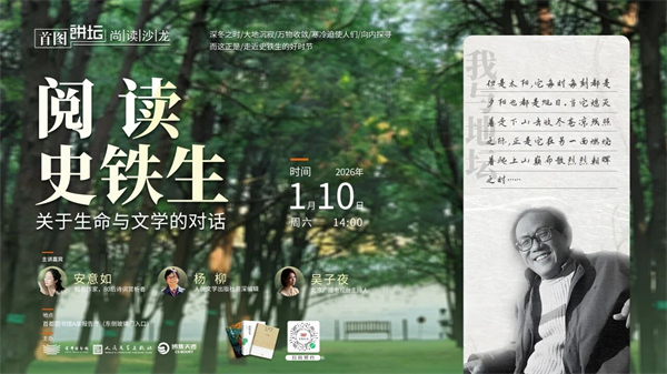 本周六,三位主讲嘉宾将做客“首图讲坛”。她们的心里住着史铁生的文字,她们也曾因这些文字欣然或深刻,她们身为女性,在自己的路上从未停下过对坚忍的执着与向光的奔跑……2026年1月10日,新年第一场尚读沙龙——安意如、杨柳、吴子夜将以“阅读”的N种打开方式,带我们共同走进史铁生的字里行间与文学世界。