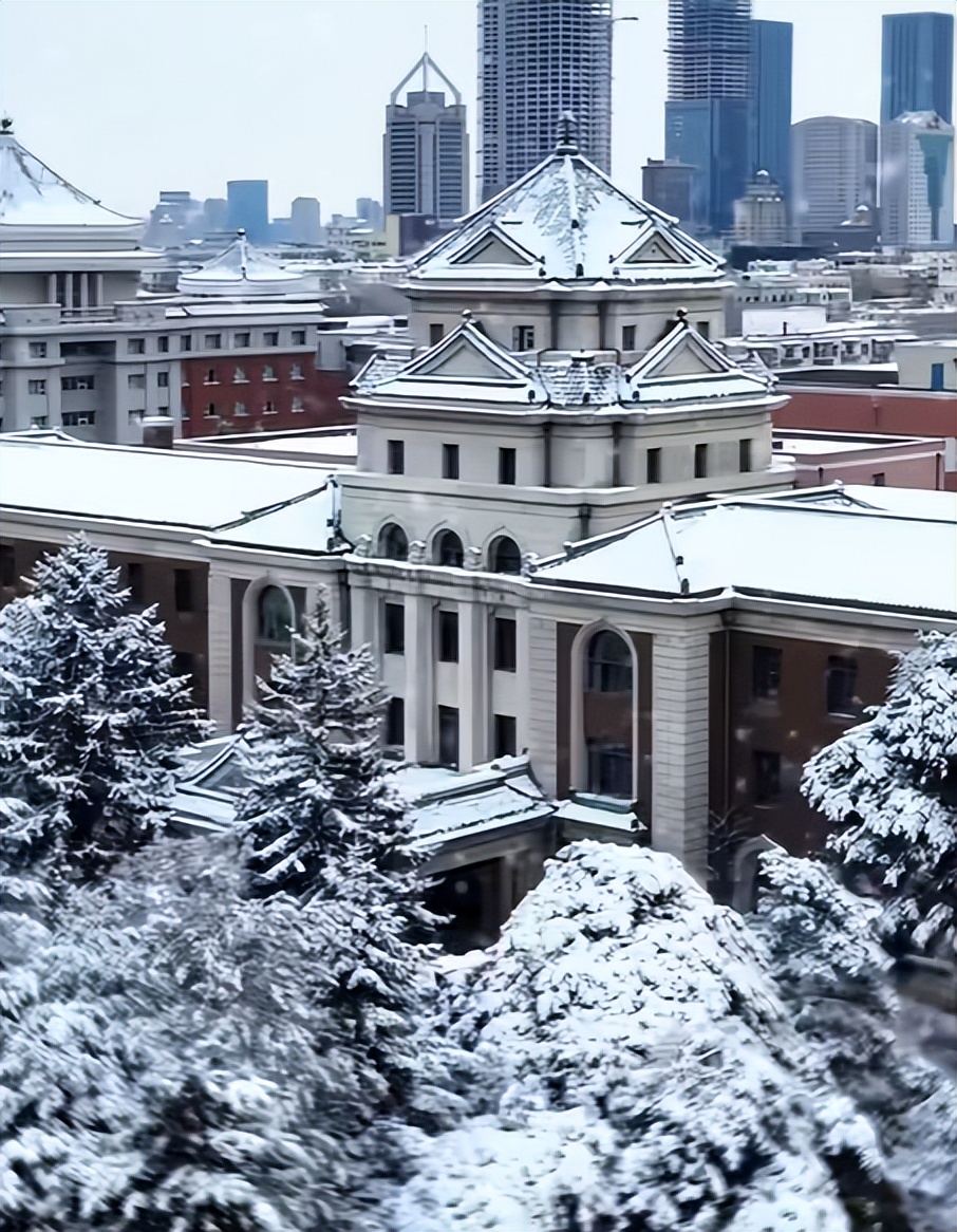这里的“观”在于其色彩的辩证法。白雪为底色,均匀地覆盖在修剪齐整的草坪、古朴的屋顶与宽阔的步道上。而赭色的历史建筑墙体、墨绿的油松、以及暖黄色创意路灯,共同构成沉稳而典雅的冬季色盘。