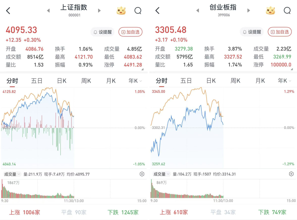 至午间收盘,上证综指涨0.3%,报4095.33点;科创50指数涨0.05%,报1455.97点;深证成指涨0.57%,报14038.46点;创业板指涨0.1%,报3305.48点。