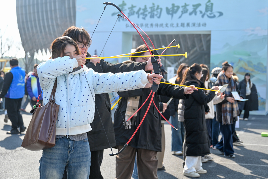 游客在体验射箭游戏。澎湃新闻记者 朱伟辉 图