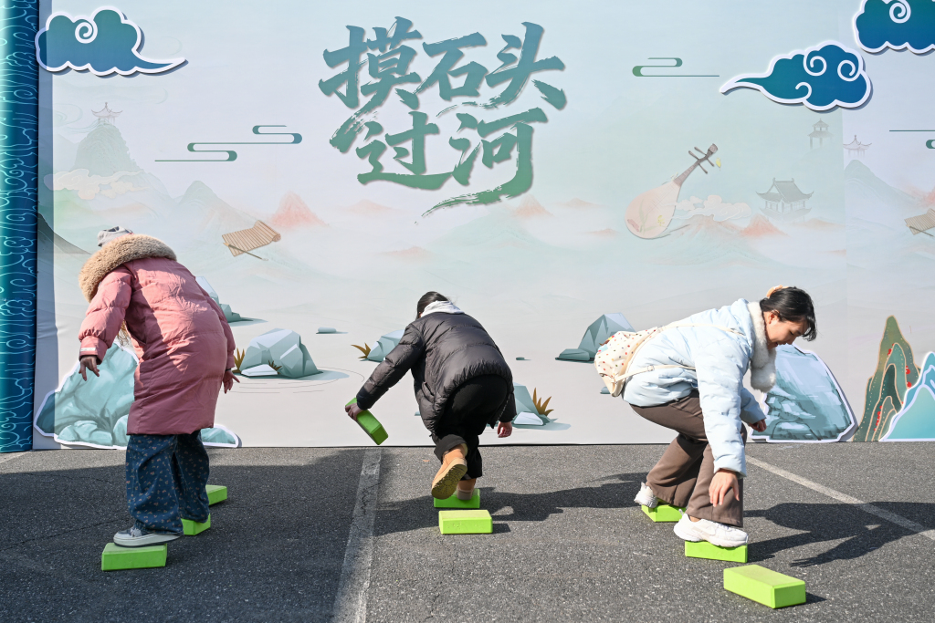 游客在体验“摸石头过河”游戏。澎湃新闻记者 朱伟辉 图