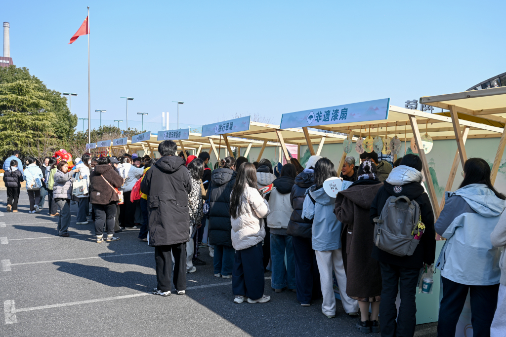 剧场外同步开设传统文化游园市集。24个主题摊位分为互动体验与静态展示两大板块,吸引众多青年沉浸参与。投壶、射箭、九连环、猜谜、飞花令等游戏区域欢声不断;非遗展示区则如一幅精致长卷:顾绣细密生动,茶艺清香袅袅,民乐乐器静待知音……青年们或亲手舞动龙狮,或提笔感受书法流转,或跟随非遗传承人体验面塑、草编制作。市集不仅成为文化展示的窗口,更化身为青年触摸历史、对话传统的活力课堂。