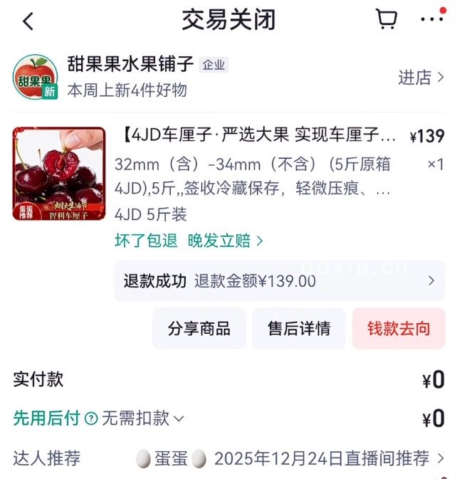 “蛋蛋”直播再陷“AB货”争议 宣称的4J车厘子只有2J大,坏果率还高