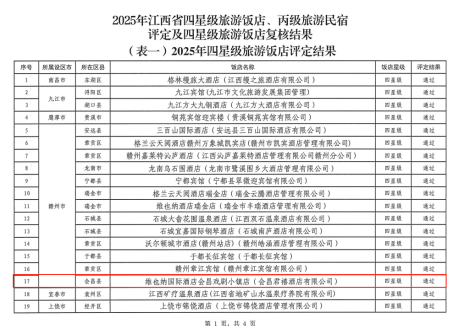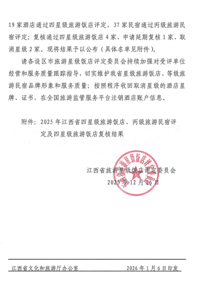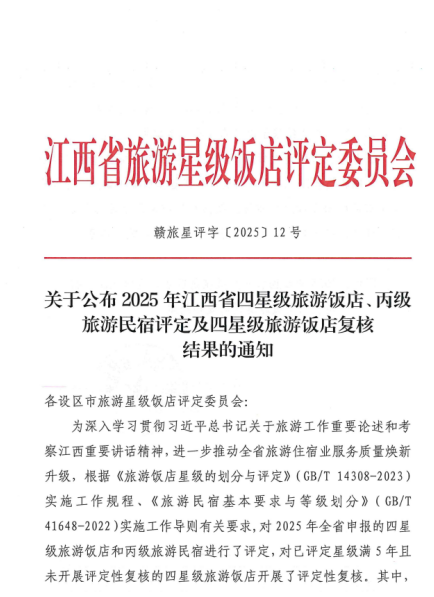 根据江西省旅游星级饭店评定委员会《关于公布2025年江西省四星级旅游饭店、丙级旅游民宿评定及四星级旅游饭店复核结果的通知》,会昌县维也纳国际酒店顺利通过四星级旅游饭店评定。