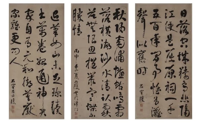 严复书陆游、苏轼三诗三条屏是现存严复最大尺幅真迹。在大尺幅恢宏规制下,笔墨浑厚朴拙,兼具颜真卿筋骨与金石质感,是1896年严复译介西学初期的精神写照。