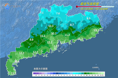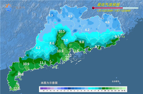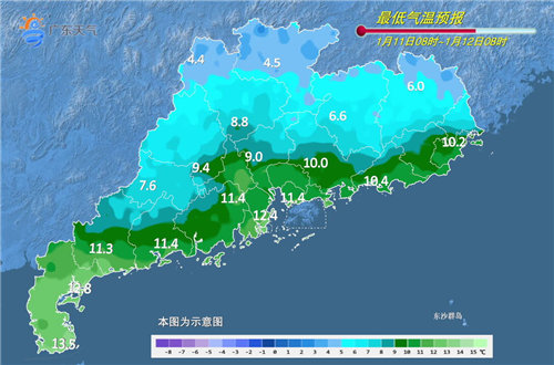 11日,我省大部晴间多云。最低气温:粤北、珠三角北部市县4~7℃,珠三角沿海市县和粤西沿海市县11~13℃,其余市县8~10℃。