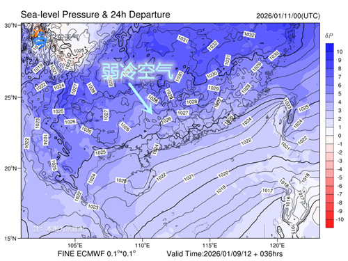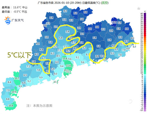 10日早晨最低气温:清远南部、广州北部、惠州南部、江门东北部、梅州北部、茂名北部较9日早晨下降了1~2℃,其余大部市县较9日早晨回升了1~2℃,最低气温具体分布:粤北大部、肇庆大部、云浮大部、广州增城、惠州龙门、汕尾海丰、揭阳揭西和潮州介于0~5℃,其中高海拔山区-4~0℃,有霜冻或冰冻,珠三角南部沿海和粤西沿海介于9~11℃,其余大部市县6~11℃,其中梅州平远录得全省最低气温-0.5℃。