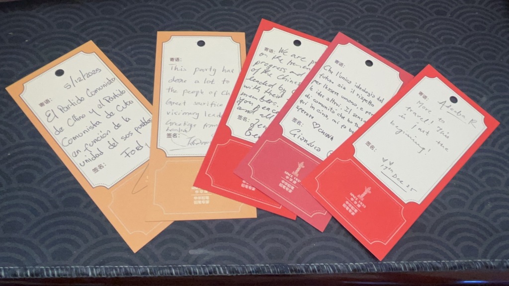 在纪念馆尾厅留言墙上,不同语言的笔迹交织出多样感悟。德国观众延斯(Jens)写道:“我们为中国人民在共产党带领下取得的成就感到自豪。”意大利参观者吉安卢卡(Gianluca)以母语留下感言:“我在中国感受到的集体归属感,让我满怀希望。”艾迪巴写道,“这是一个开始,我还会再来。”