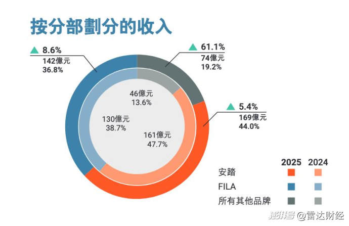 而同期FILA品牌实现收入142亿元,营收占比达36.8%,已成为安踏体育营收的第二大支柱;其余品牌则合计贡献收入74亿元,占总营收的19.2%。