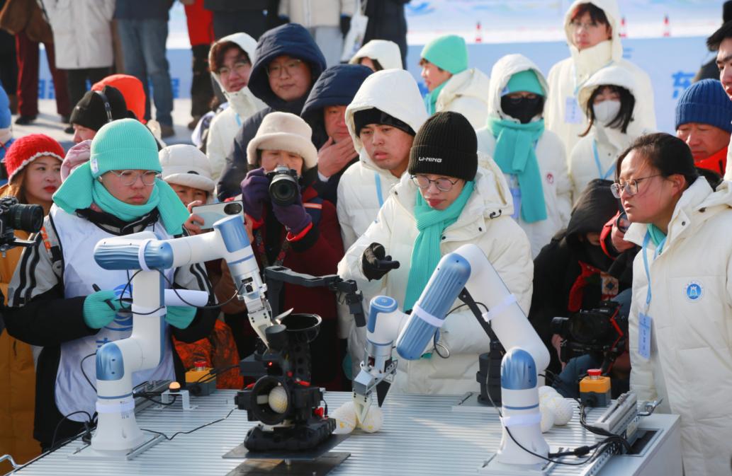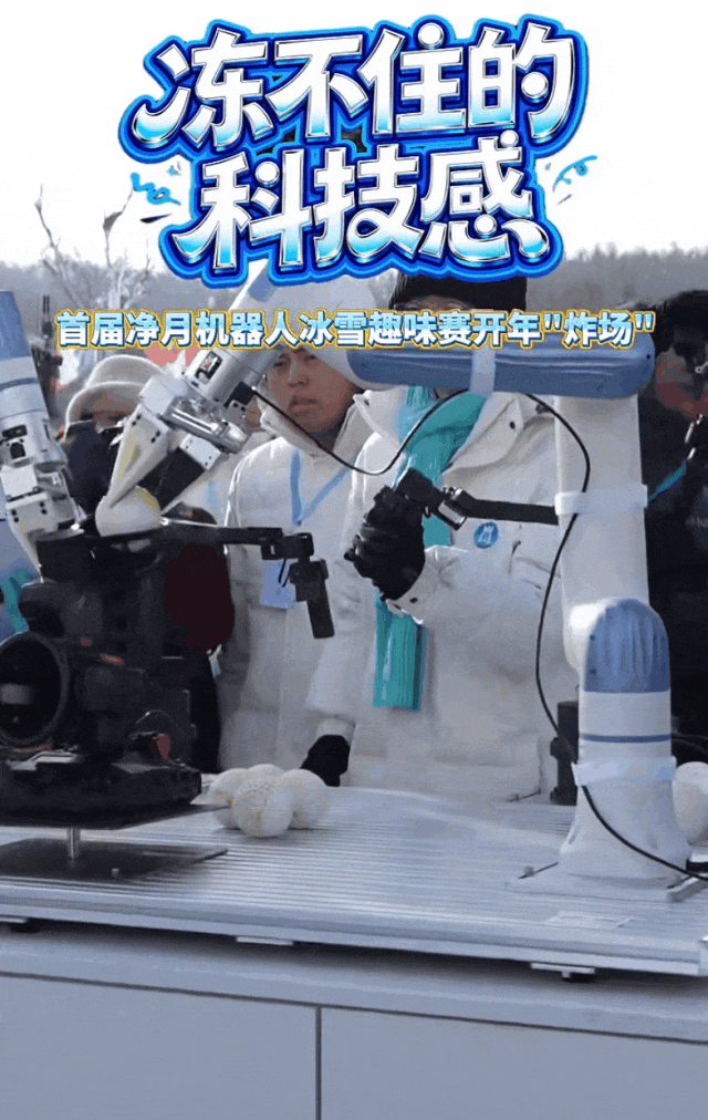 机器人雪球投掷赛现场,双臂协作机器人成为焦点。它们精准抓取雪球,全力投掷向标靶,每一次命中都引来观众的阵阵喝彩。