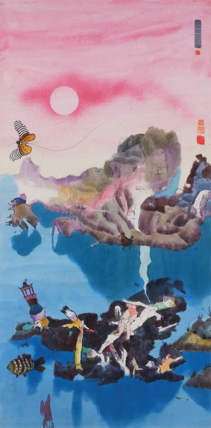 1970-1990年代他进入艺术创作的“幻境”阶段,代表作品如《有飞蛾的风景》《七人物》等,构建出一个逻辑自洽又光怪陆离的“陈福善宇宙”-2。展厅中,天地倒置、万物悬浮,鱼翔天际、楼潜深海,形成独特的魔幻现实主义风格。