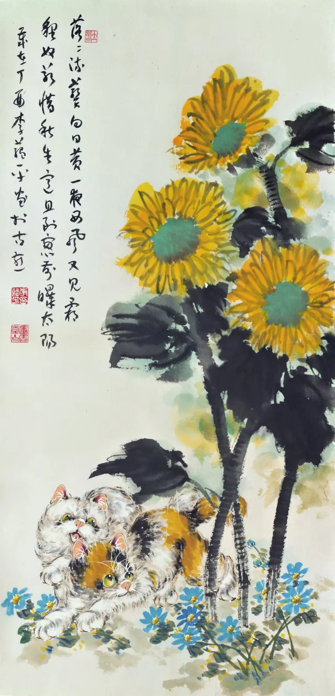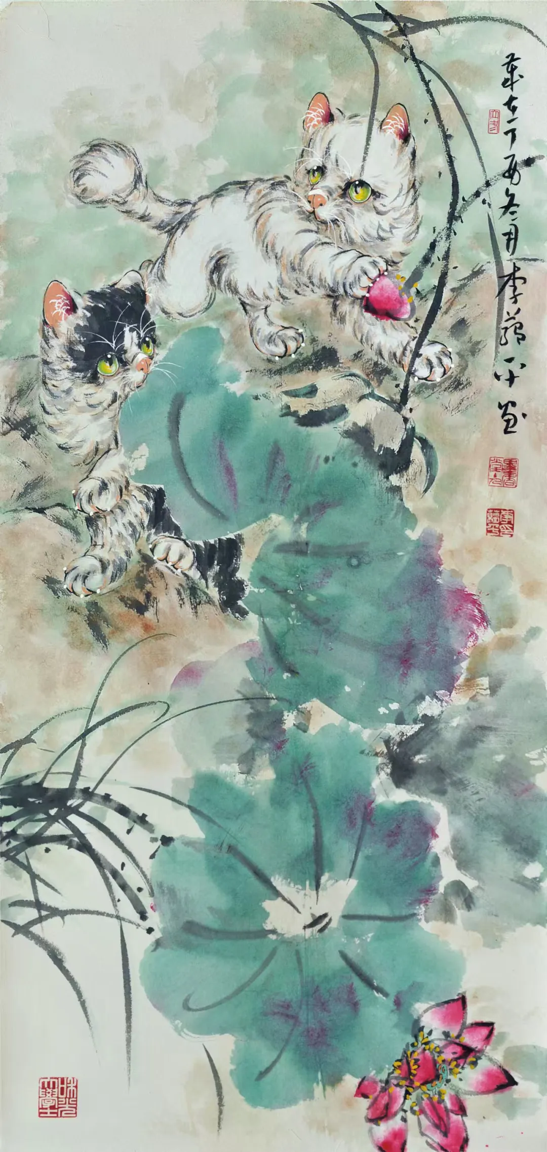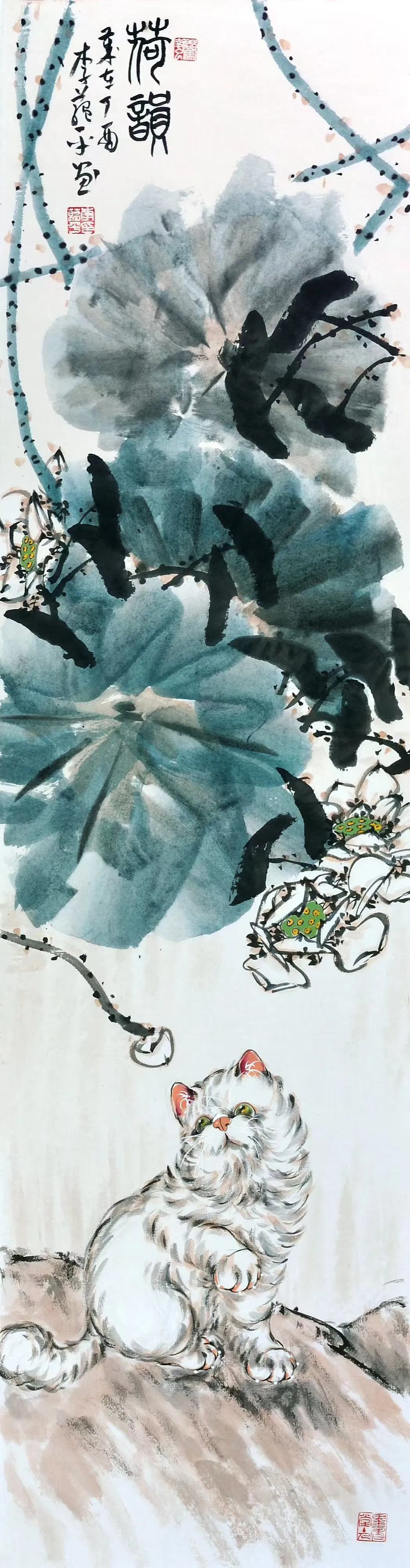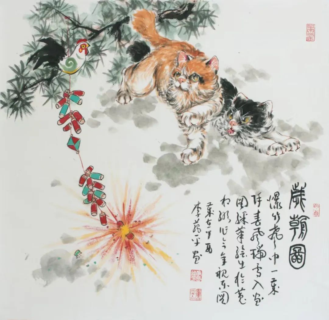 李蕴平作为孙菊生先生的入室弟子,其中国画师承著名画猫名家孙菊生先生,并受到王雪涛、龚继先、李世麟、陈葆棣等诸位先生的指导。其国画作品继承了恩师孙菊生的画风,以画猫见长,并配以草书长题格律诗词,诗书画一体。近年常以版印入画,画印结合,另有新意,继往开来,独辟蹊径。出版有《孔版画技法与教学》1《蕴平画猫》、《白猫百态》3等专业书籍和画册。