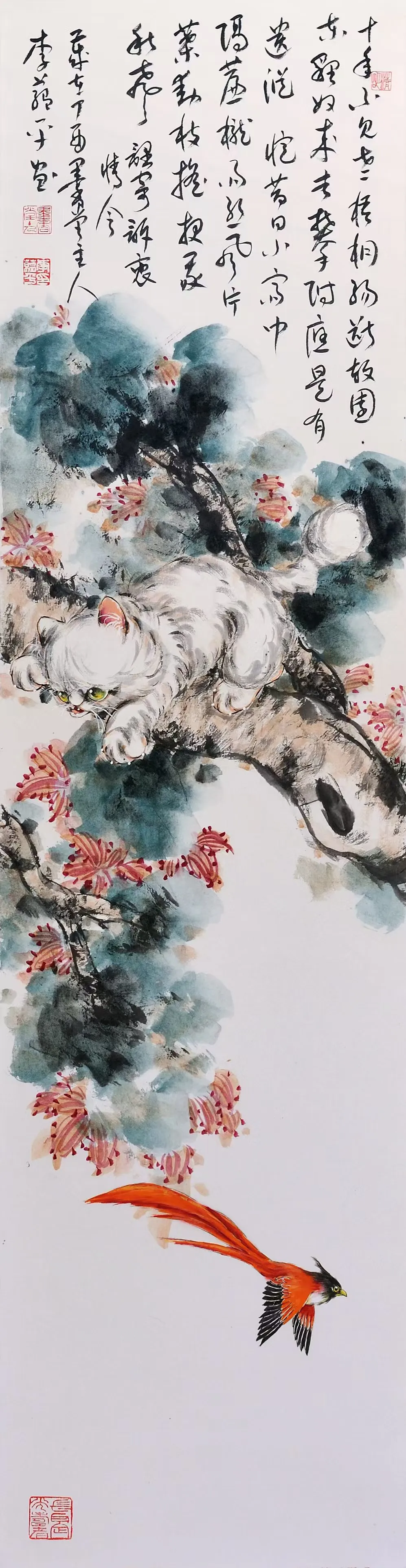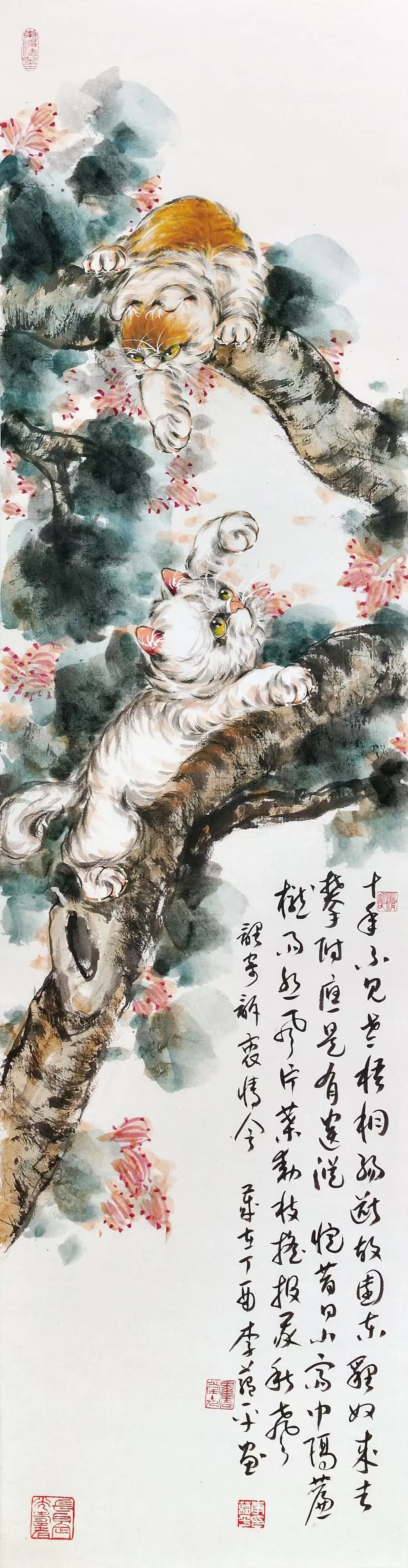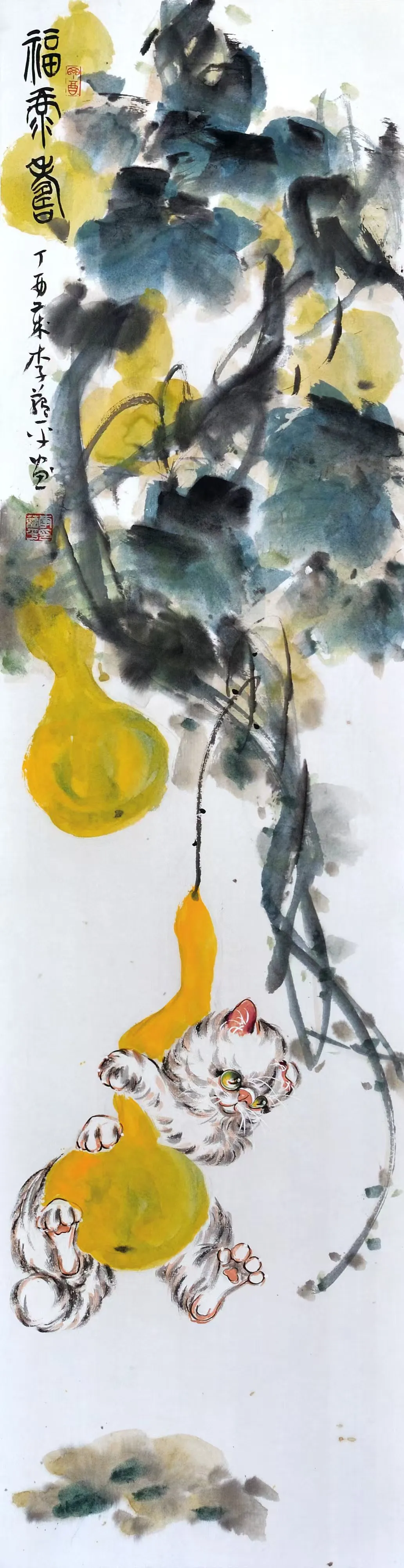 李蕴平作为孙菊生先生的入室弟子,其中国画师承著名画猫名家孙菊生先生,并受到王雪涛、龚继先、李世麟、陈葆棣等诸位先生的指导。其国画作品继承了恩师孙菊生的画风,以画猫见长,并配以草书长题格律诗词,诗书画一体。近年常以版印入画,画印结合,另有新意,继往开来,独辟蹊径。出版有《孔版画技法与教学》1《蕴平画猫》、《白猫百态》3等专业书籍和画册。